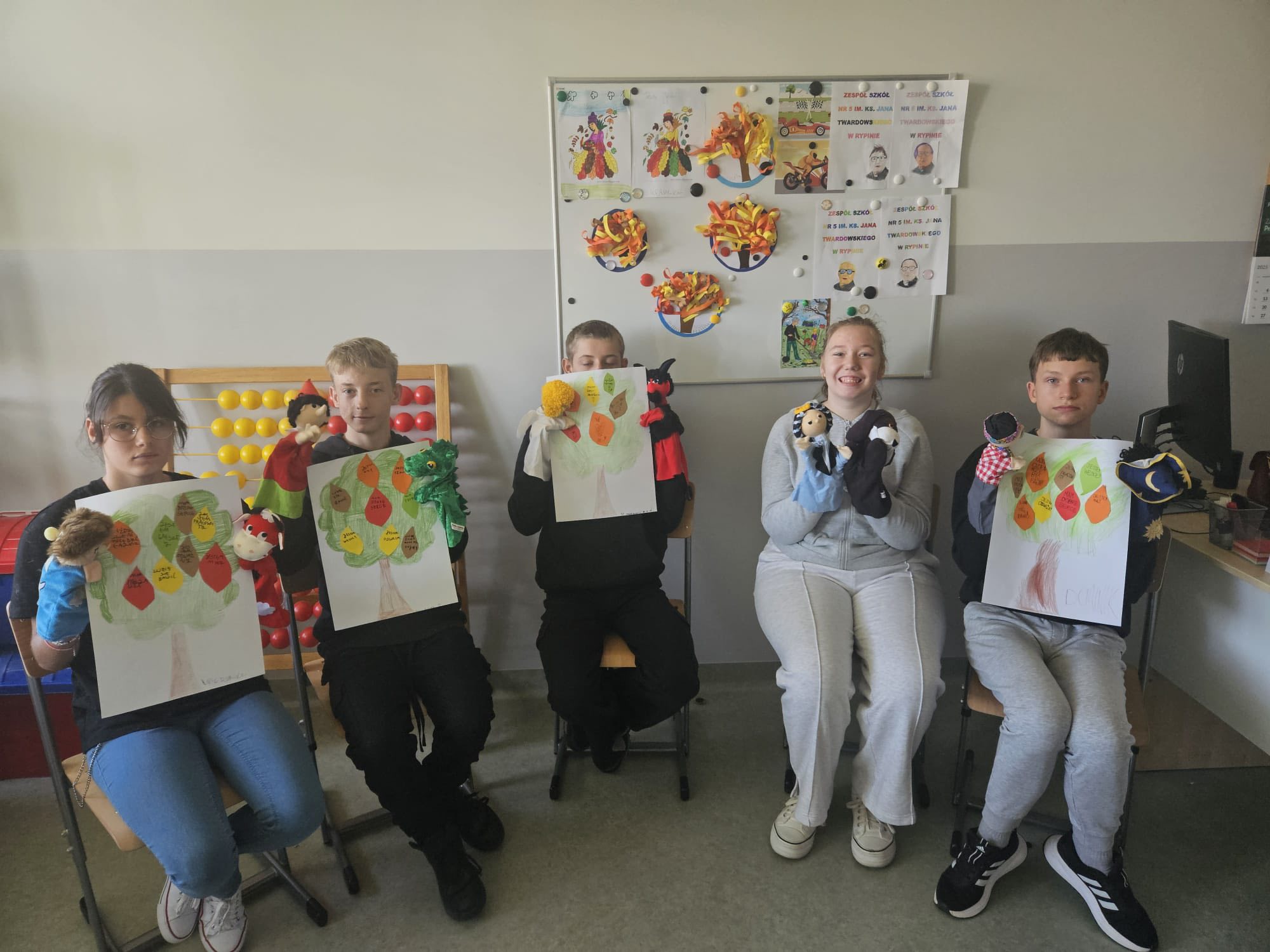 W ramach ,,Tygodnia o przeciwdziałaniu przemocy" uczniowie klasy VII - VIIIF na zajęciach z panią M. Malinowską uczestniczyli w zabawach z pacynkami i instrumentami muzycznymi, których celem było rozpoznawanie i nazywanie emocji. Dzięki pacynkom uczniowie uczyli się wyrażać swoje uczucia w bezpieczny i kreatywny sposób a instrumenty pomagały im oddawać nastrój poprzez dźwięki. Dodatkowo powstało „Drzewo pozytywnych myśli”, na którym dzieci umieszczały swoje dobre skojarzenia, marzenia i miłe słowa. Zajęcia sprzyjały rozwijaniu empatii, samoświadomości emocjonalnej oraz budowaniu pozytywnej atmosfery w grupie.